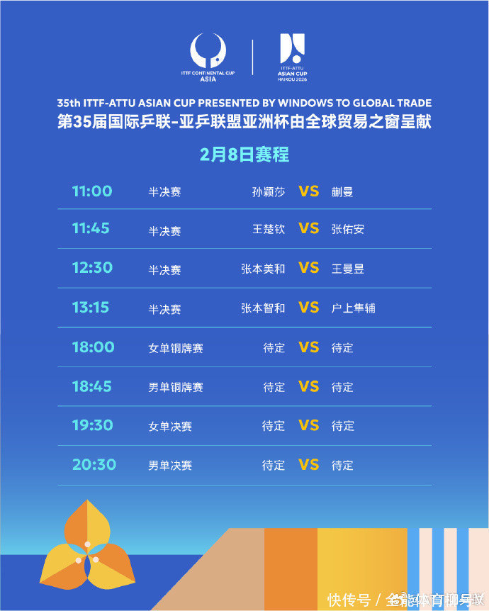 北京时间2月8日消息,2026年乒乓球亚洲杯将展开女单半决赛的争夺,CCTV5、CCTV央视频直播比赛实况。男单1/4决赛,王楚钦以4-2战胜队友周启豪,林诗栋以3-4被日本选手户上隼辅逆转。半决赛,王楚钦对阵中国台北选手张佑安,日本选手张本智和迎战队友户上隼辅。