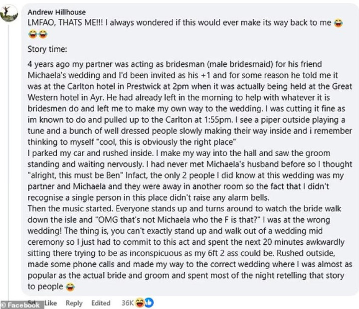 安德鲁承认,他在米歇尔和约翰的婚礼上蹭了一杯可乐,接着给男友电话,这才知道正确的婚礼地点离这里有多远。
