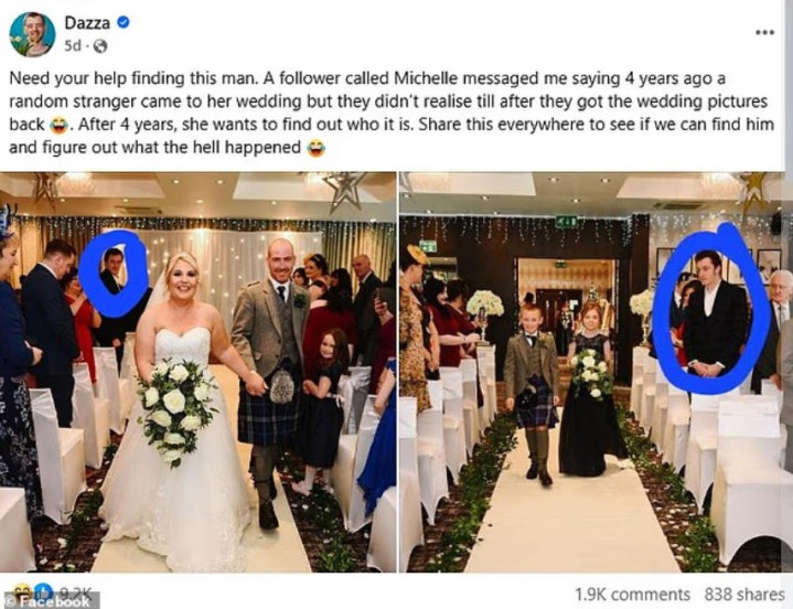 新娘米歇尔说:“我们先问了父母,然后问了我的几位姨妈和其他客人,最后是我朋友,但根本没人认识他。”