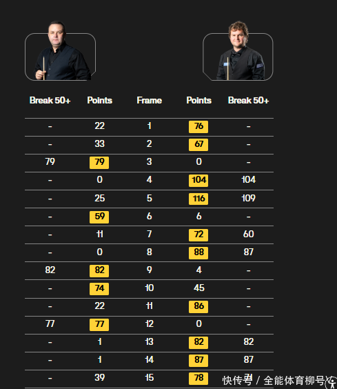 这场比赛第一阶段,海菲尔德取得6-3领先优势,具体比分为:76-22、67-33 、0-79(76)、104(104)-0、109(109)-25、6-59、72(60)-11、88(88)-0、4-82(82)。经过短暂的休息,海菲尔德与马奎尔展开第二阶段成都配资网的争夺。