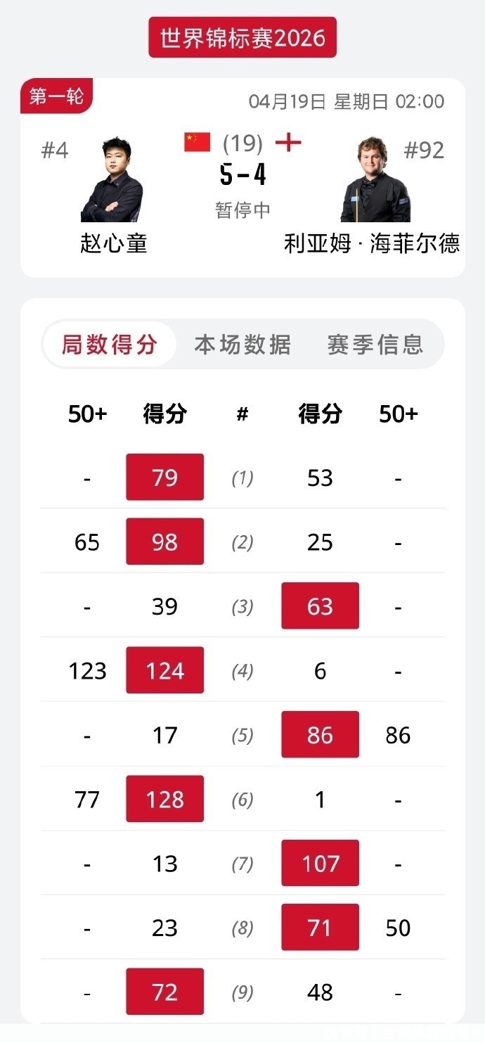 北京时间4月19日凌晨,2026斯诺克世锦赛正式开杆。刚刚结束的揭幕战,卫冕冠军赵心童拒绝冷门,他以总比分10-7战胜资格赛选手利亚姆-海菲尔德,取得本次世锦赛的开门红。本次比赛第一阶段,赵心童在对手的顽强阻击下,仅以5-4领先一局。